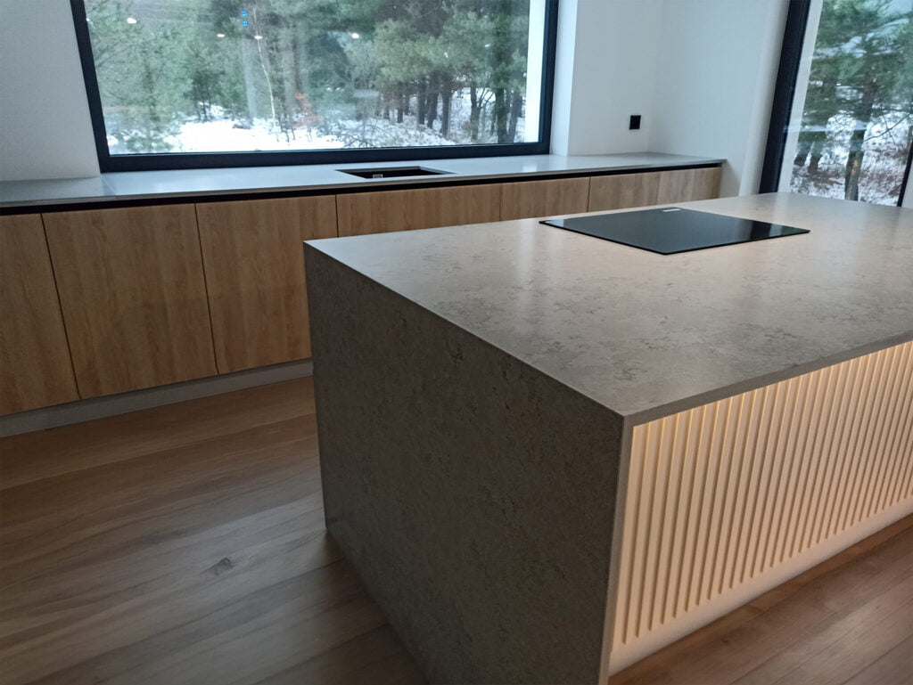 Blat kuchenny z konglomeratu to alternatywa dla naturalnego kamienia, ceniona za nowoczesny wygląd, jednolitą strukturę i szeroki wybór kolorów. Dzięki zawartości żywic i zmielonego kamienia, jest lżejszy od granitu, łatwiejszy w obróbce i często bardziej atrakcyjny cenowo. Blat kuchenny z konglomeratu świetnie sprawdza się w nowoczesnych kuchniach, gdzie istotna jest spójność wizualna i estetyka całej zabudowy. Co więcej, łatwiej dopasować go do innych elementów wnętrza, np. parapetów, wysp czy ścian.